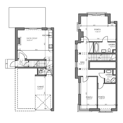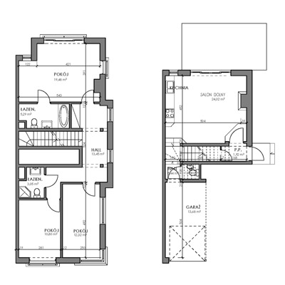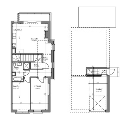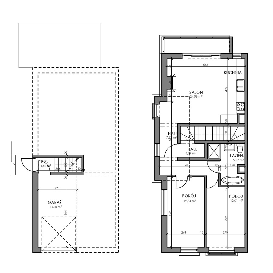 Salon + aneks kuchenny 24,02 m2 WC 1,18 m2 Hall 5,44 m2 Przedpokój 1,92 m2 Stanowisko parkingowe w garażu pow. 13,68 m2 Ogródek ok. 80 m2 II Poziom